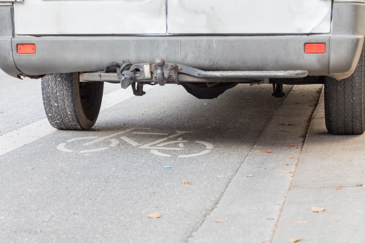 The video shows a dual-lane bike path flanked by parked cars and traffic. In a shocking twist, one motorist pulls off of the road and into the bike path, seemingly to avoid traffic. The driver proceeds down the path, getting dangerously close to a few cyclists.