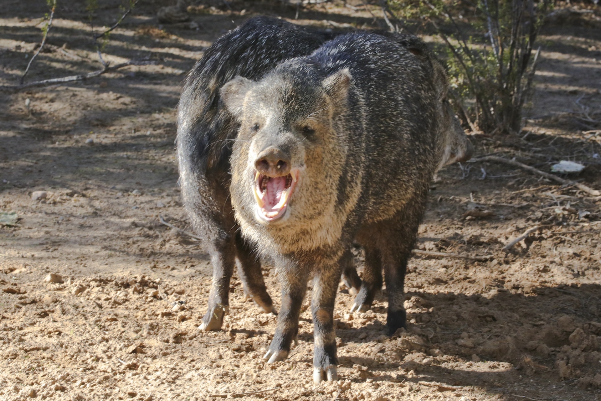 Javelinas are also known as peccaries. They're similar to pigs but have a more complex digestive system. They can be told apart from pigs by the shape of their tusks. Pig tusks are long and curve around themselves, while javelina tusks are short and straight. Javelina tusks interlock, which prohibits side-to-side jaw movement.