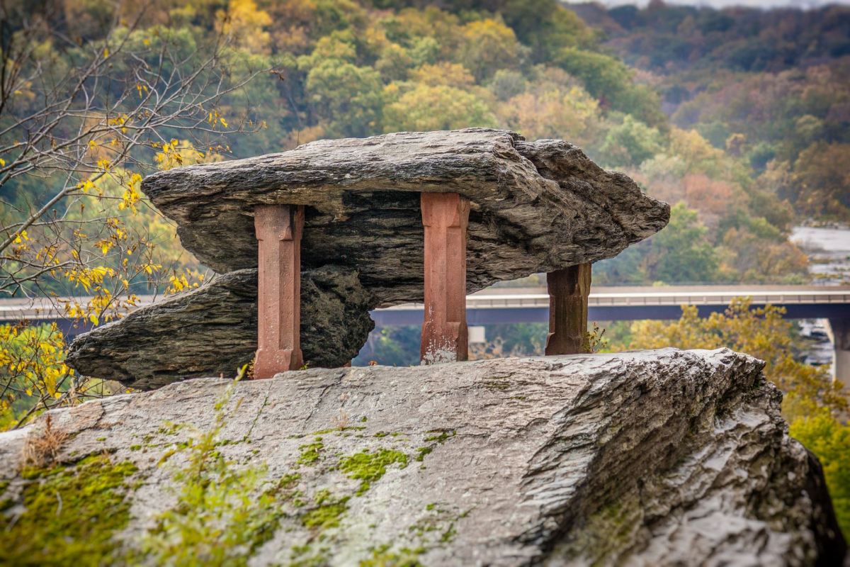 Jefferson Rock marks the spot where Founding Father Thomas Jefferson once stood on October 25, 1783, overlooking Virginia and Maryland. The rock originally rested on another stone, but it was replaced by four stone pillars around 1860.