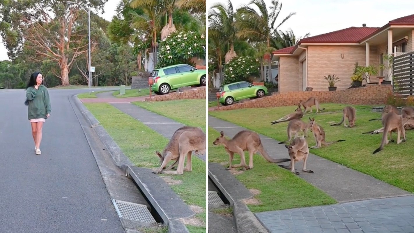 In a viral video posted on TikTok, Veronica (@veronicadownunder) films a woman casually strolling down a residential street in Australia. As the camera pans over, viewers can see 10 or so kangaroos relaxing on the sidewalk and in a front yard.
