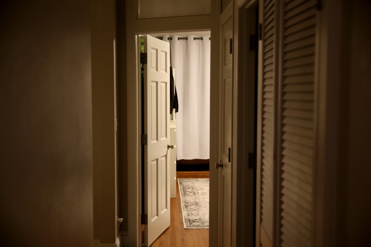 The furry creature glanced back at the couple before attempting to climb a nightstand while they debated how they should corral the animal.