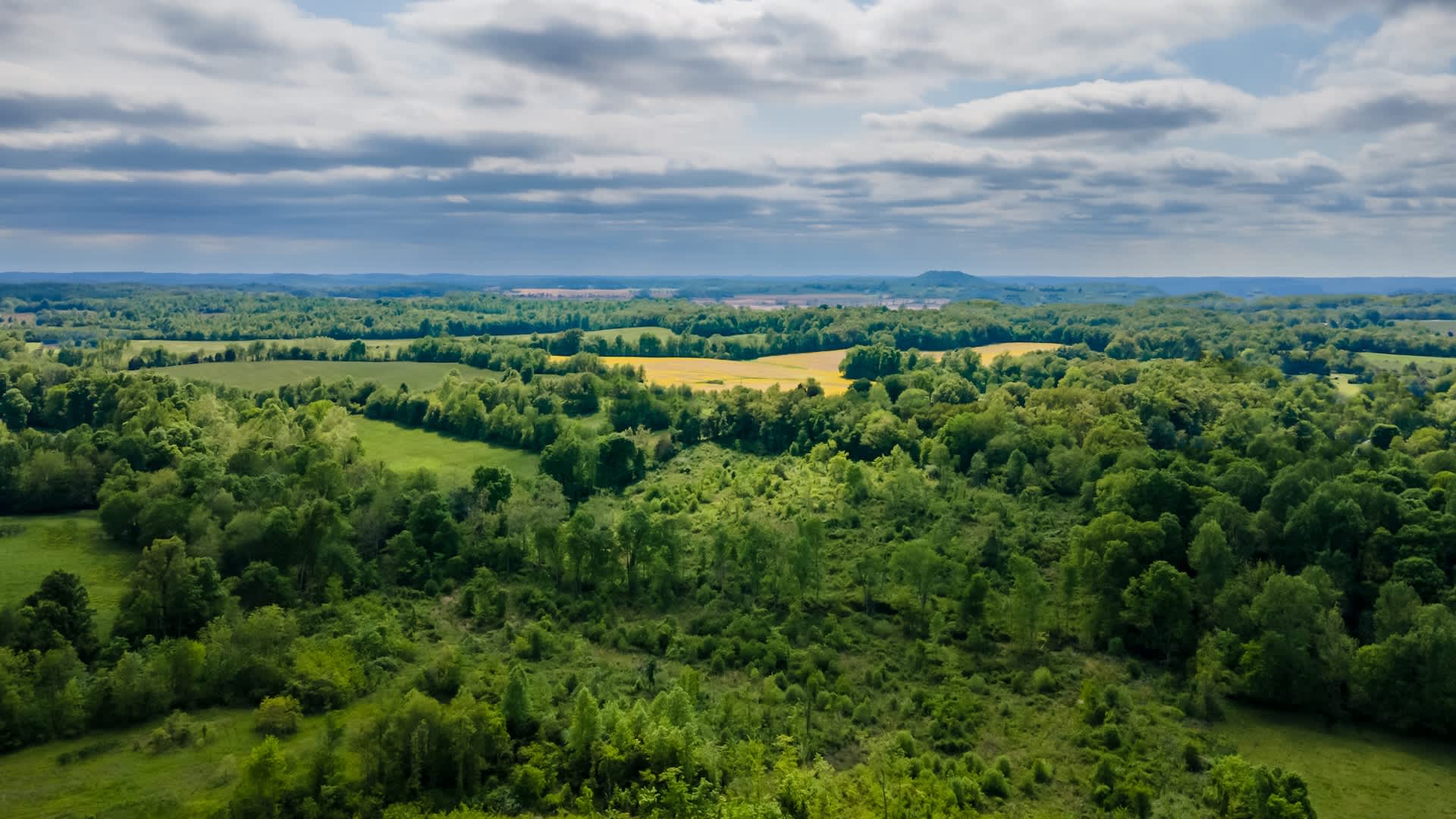 A panoramic view of lush green fields and forests under a partly cloudy sky.