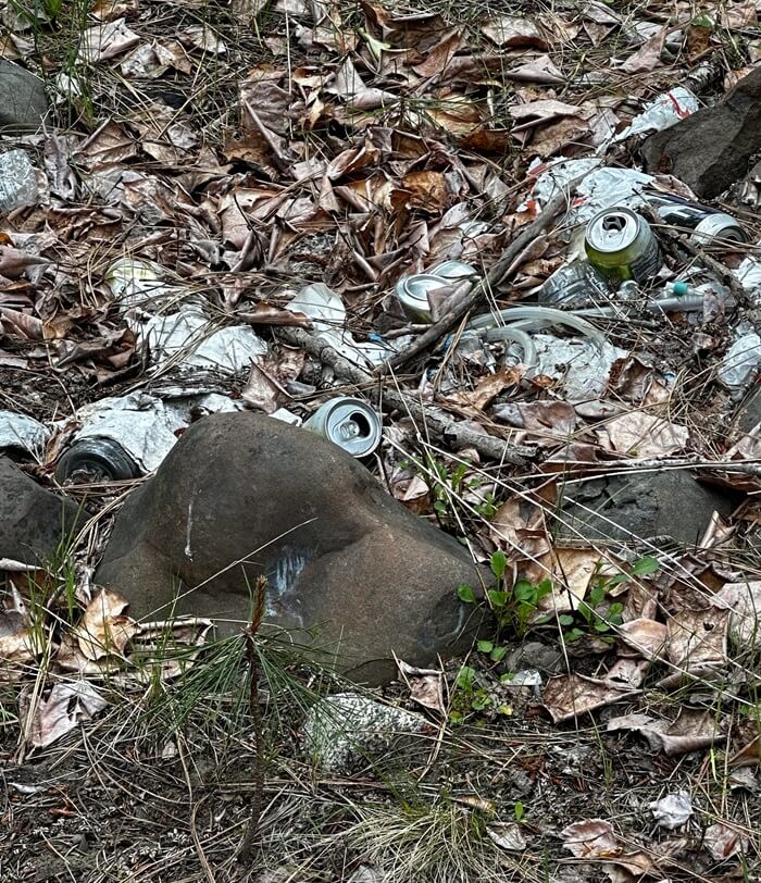 Their photos depict several plastic bags, old beer cans, food wrappers, plastic water bottles, and even a bulging trash bag hanging from a tree.