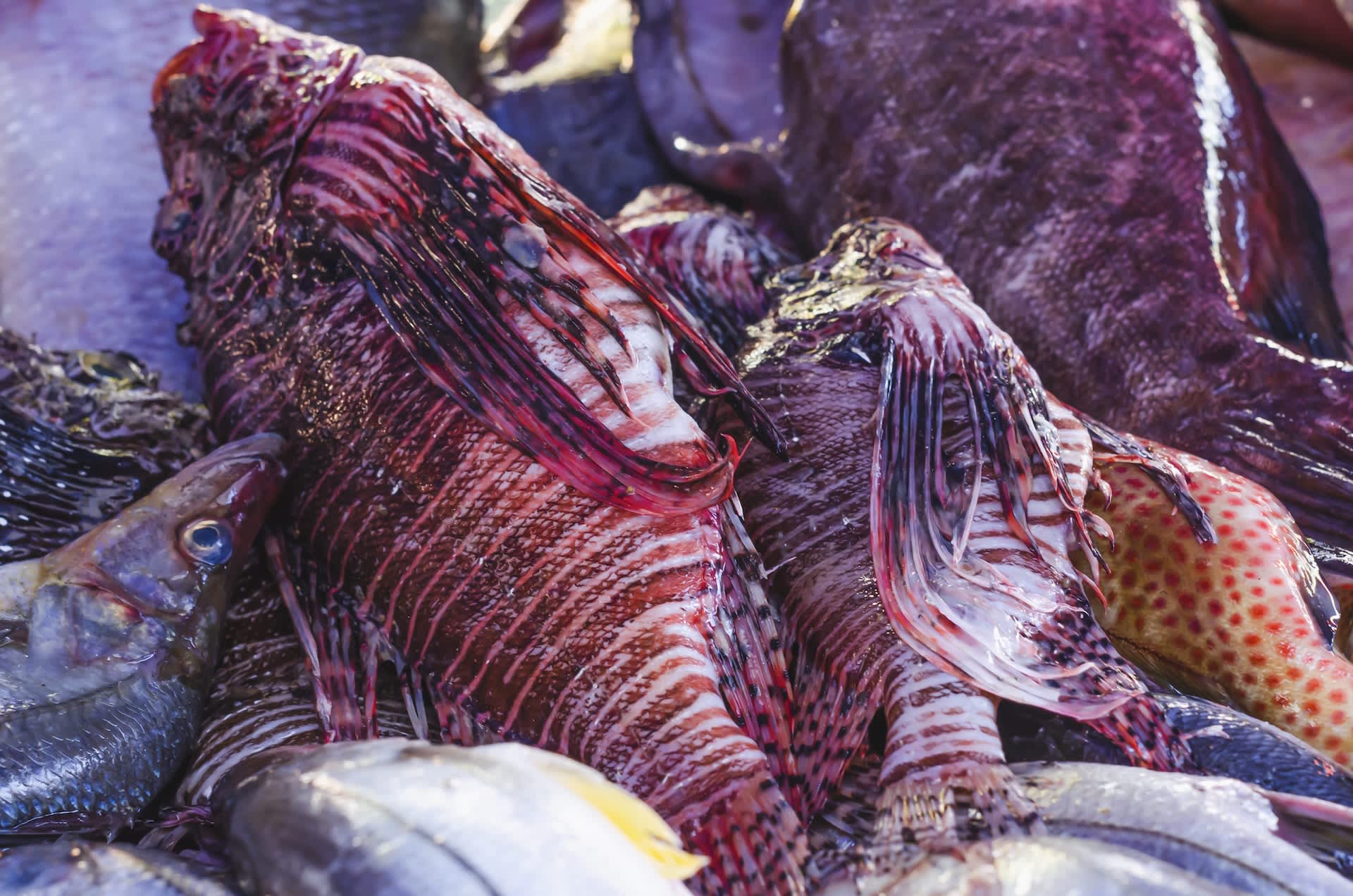 Lionfish are beautiful sea creatures with brown or red and white stripes and an array of venomous spines. They devour vast amounts of other marine life and cause biodiversity problems, according to the North American Invasive Species Management Association.