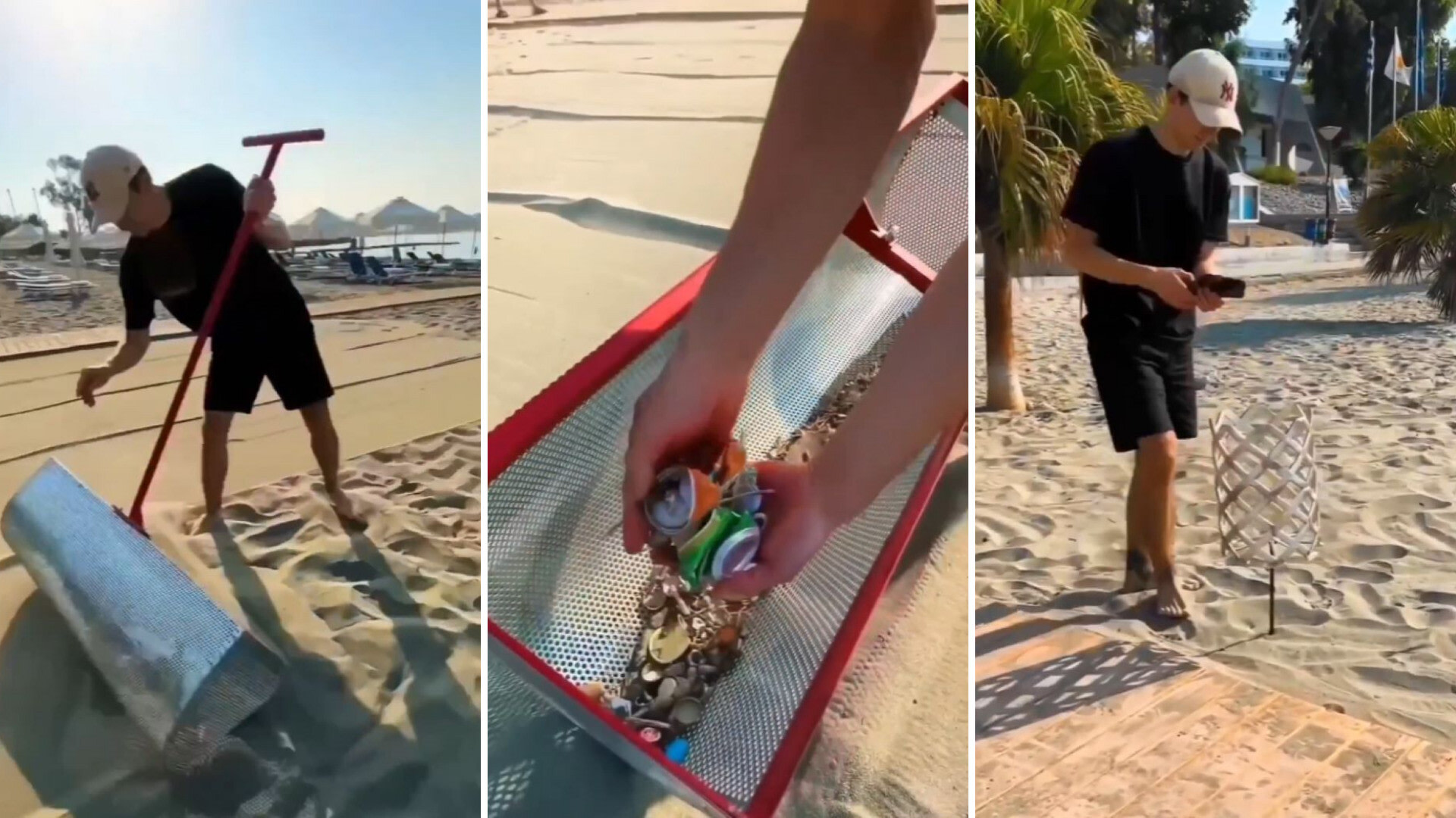 The video was posted to Instagram by an account called Awake Spiritual (@awake_spiritual), although it does not appear to have been created or owned by that account. It shows a person combing a beach with a special giant sand-combing rake to collect a small pile of metal trash, including soda cans, random springs, bottle caps, aluminum foil, and even some coins.