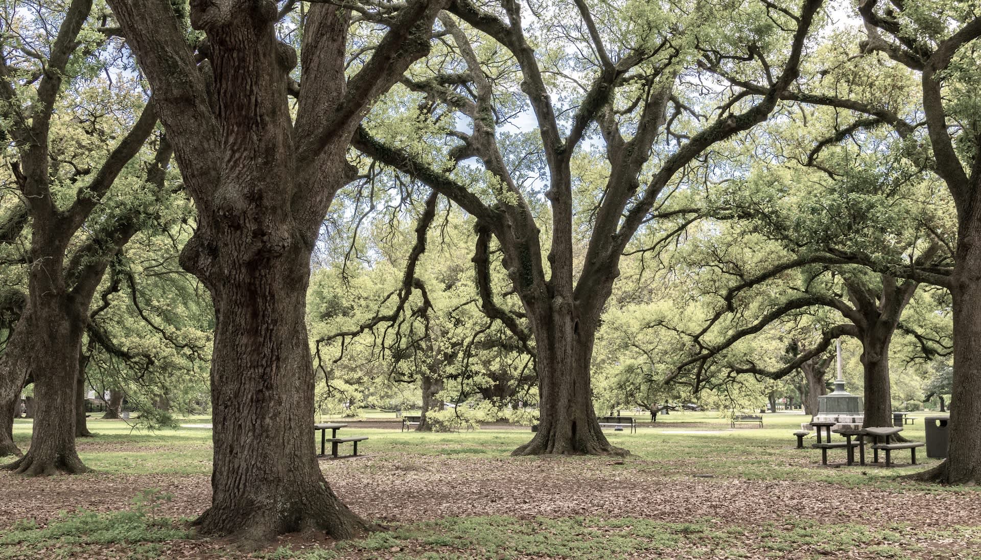 A tranquil park scene featuring large trees, picnic tables, and patches of grass on a sunny day.