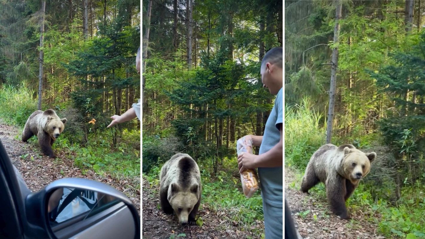 The Instagram account Tourons of National Parks (@touronsofnationalparks) shared a video of a man in Romania standing outside of his car and tossing food to a large brown bear in a forest.