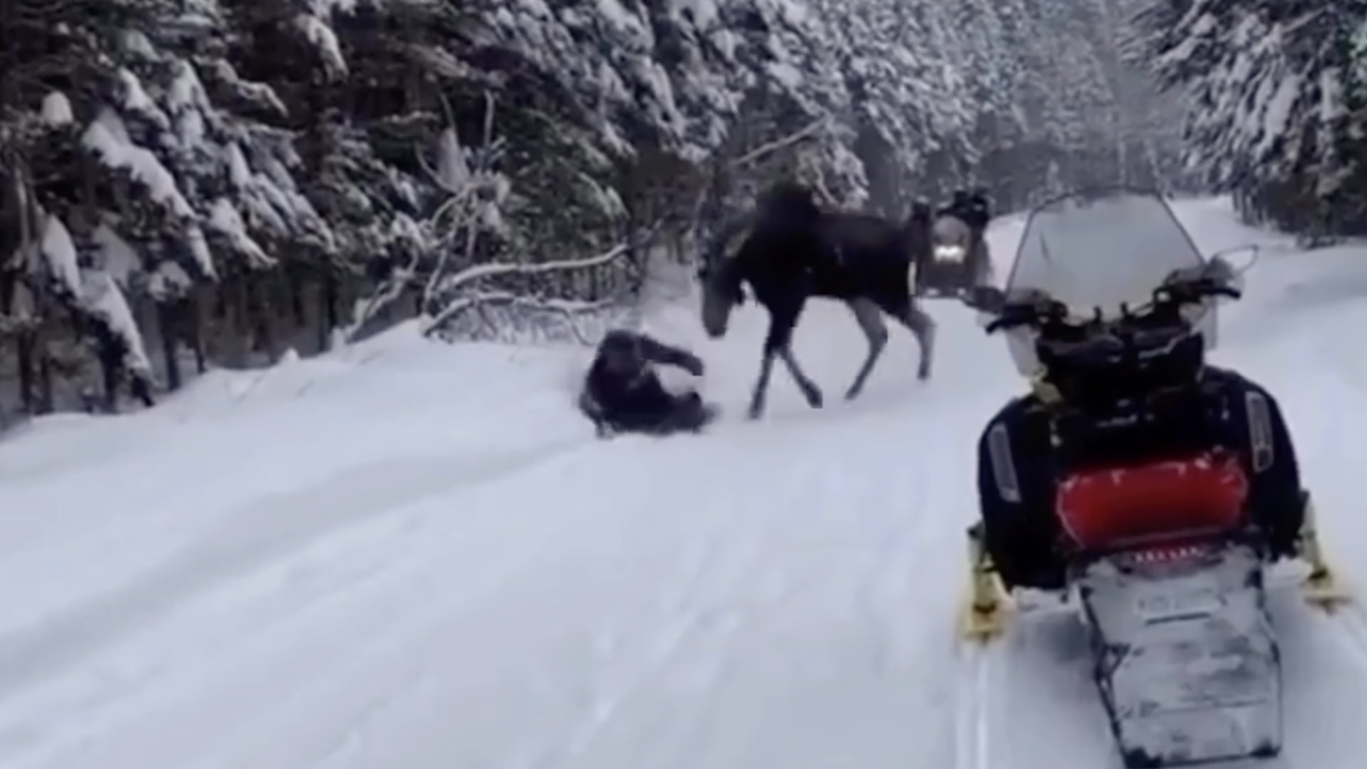 The viral video, shared by the popular Tourons of National Parks account (@touronsofnationalparks), posted on Jan. 17, shows a group of snowmobilers encountering a bull moose. One of them approaches the wild animal, and the interaction doesn't go as planned.
