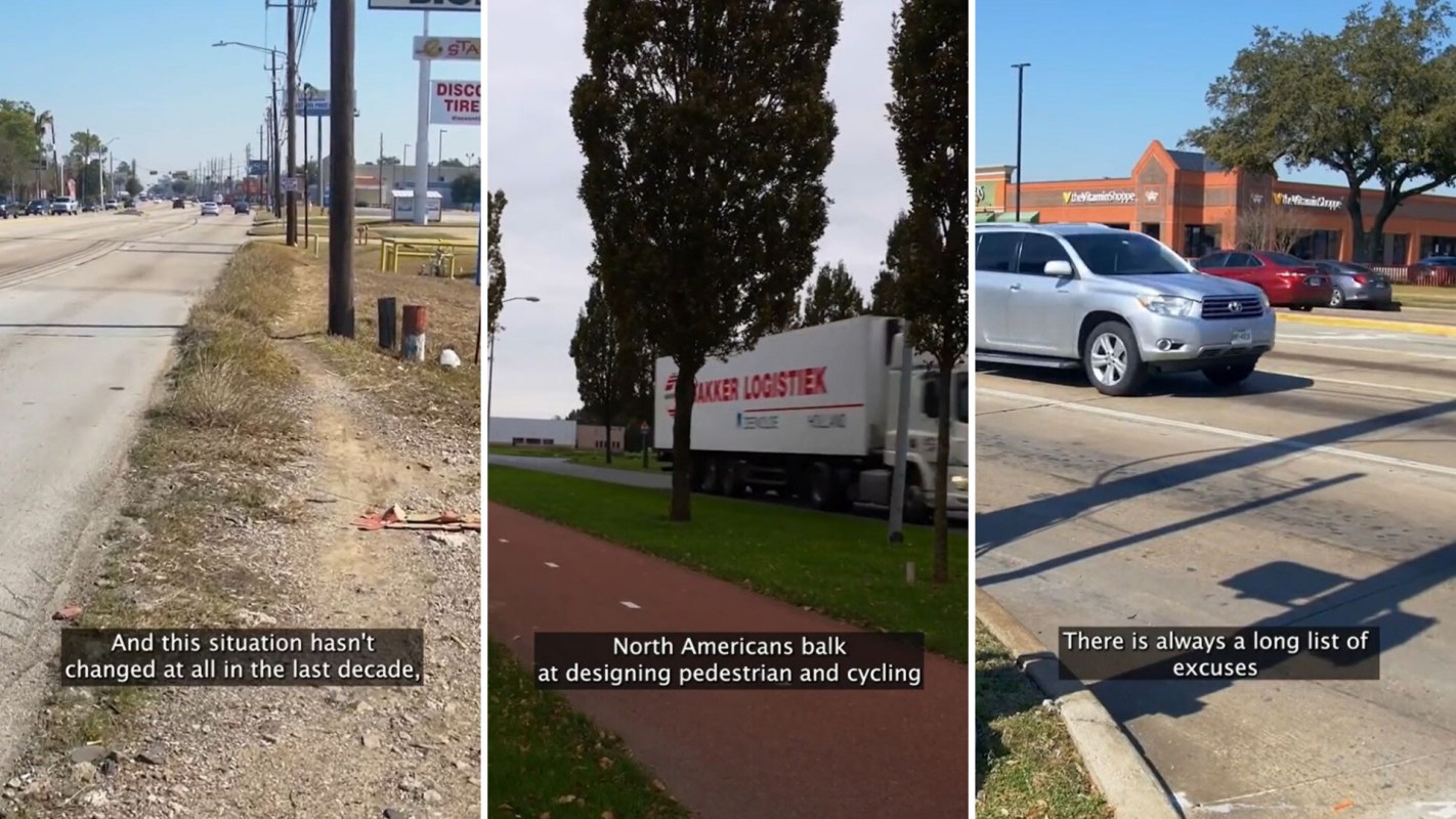 In a viral video, TikToker Not Just Bikes (@notjustbikes) shared his experience attempting to be a pedestrian in suburban Houston.