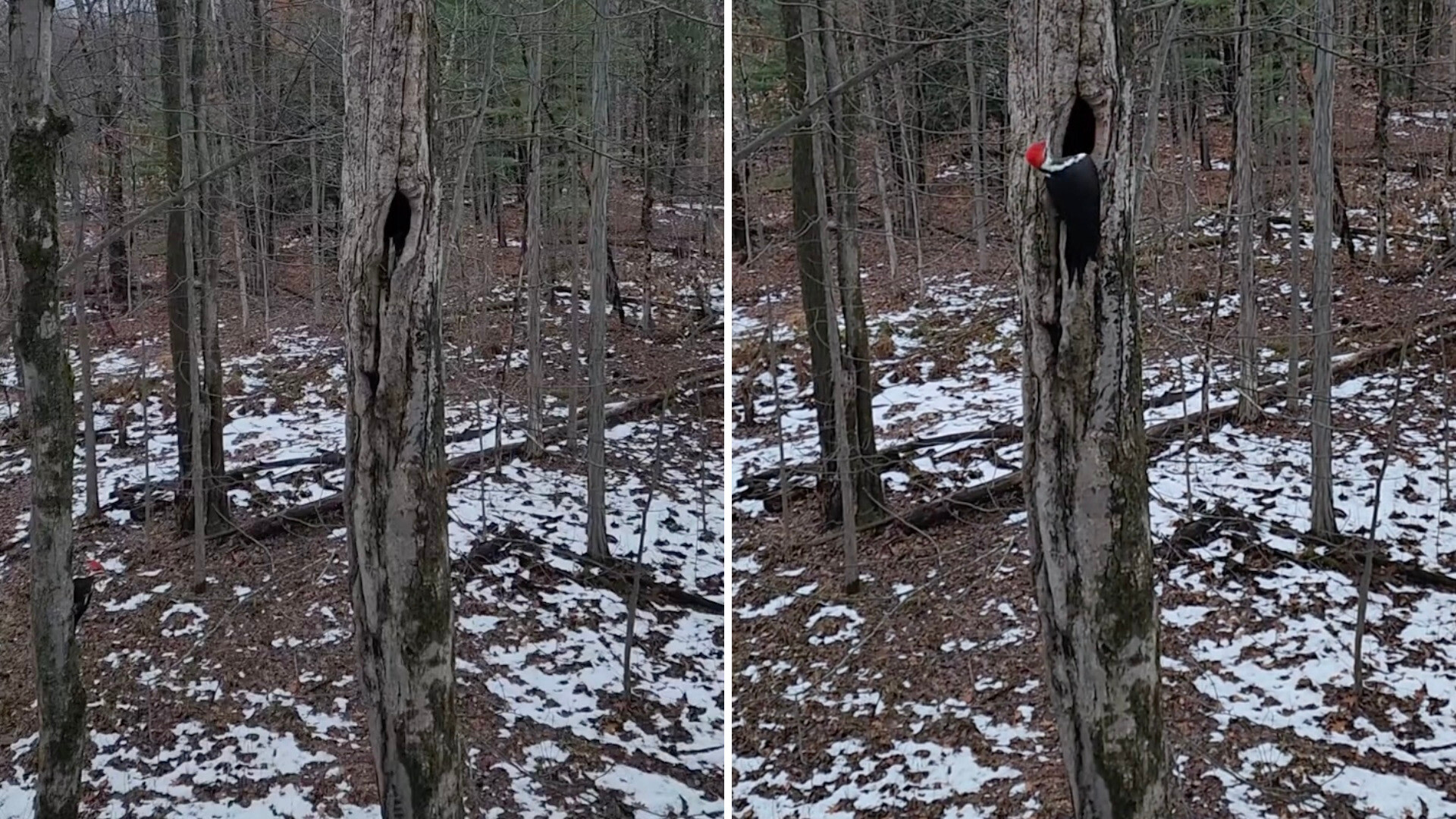 The clip showed a large black-and-white woodpecker with red feathers on its head circling the tree, making loud taps as it moved. It goes on for a minute or so, until the bird finally ducks into the hole on the side of the trunk.