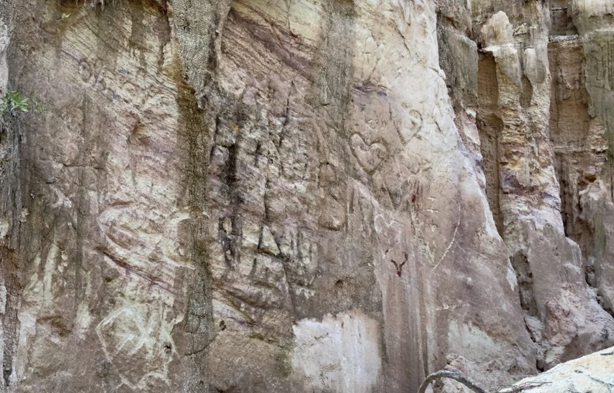 They posted several photos of the bluff walls, where the soft sandstone has clearly been mutilated, covered in overlapping letters and crude drawings.