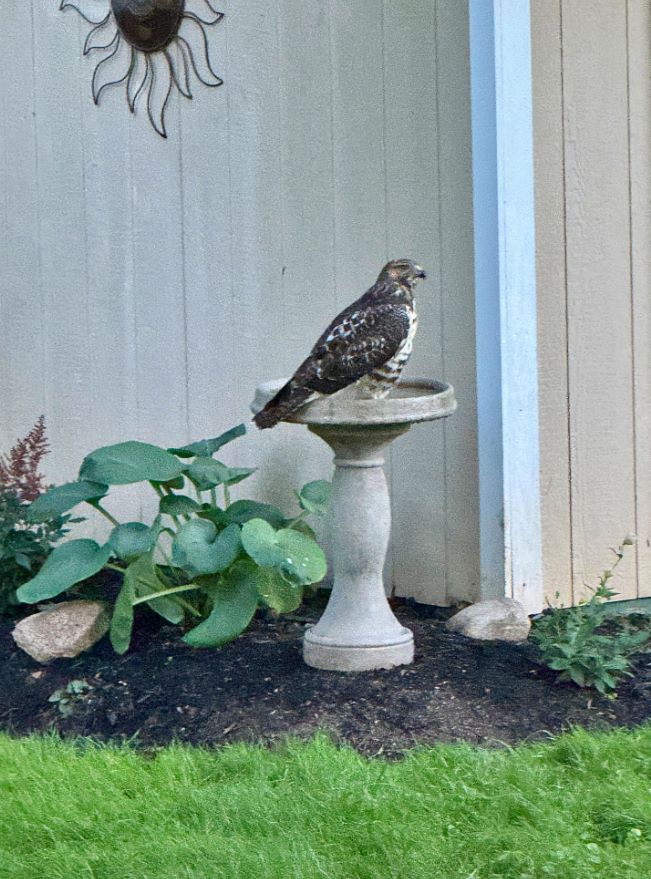 One Redditor took to r/gardening to document a hawk that paid a visit to their backyard bird bath.