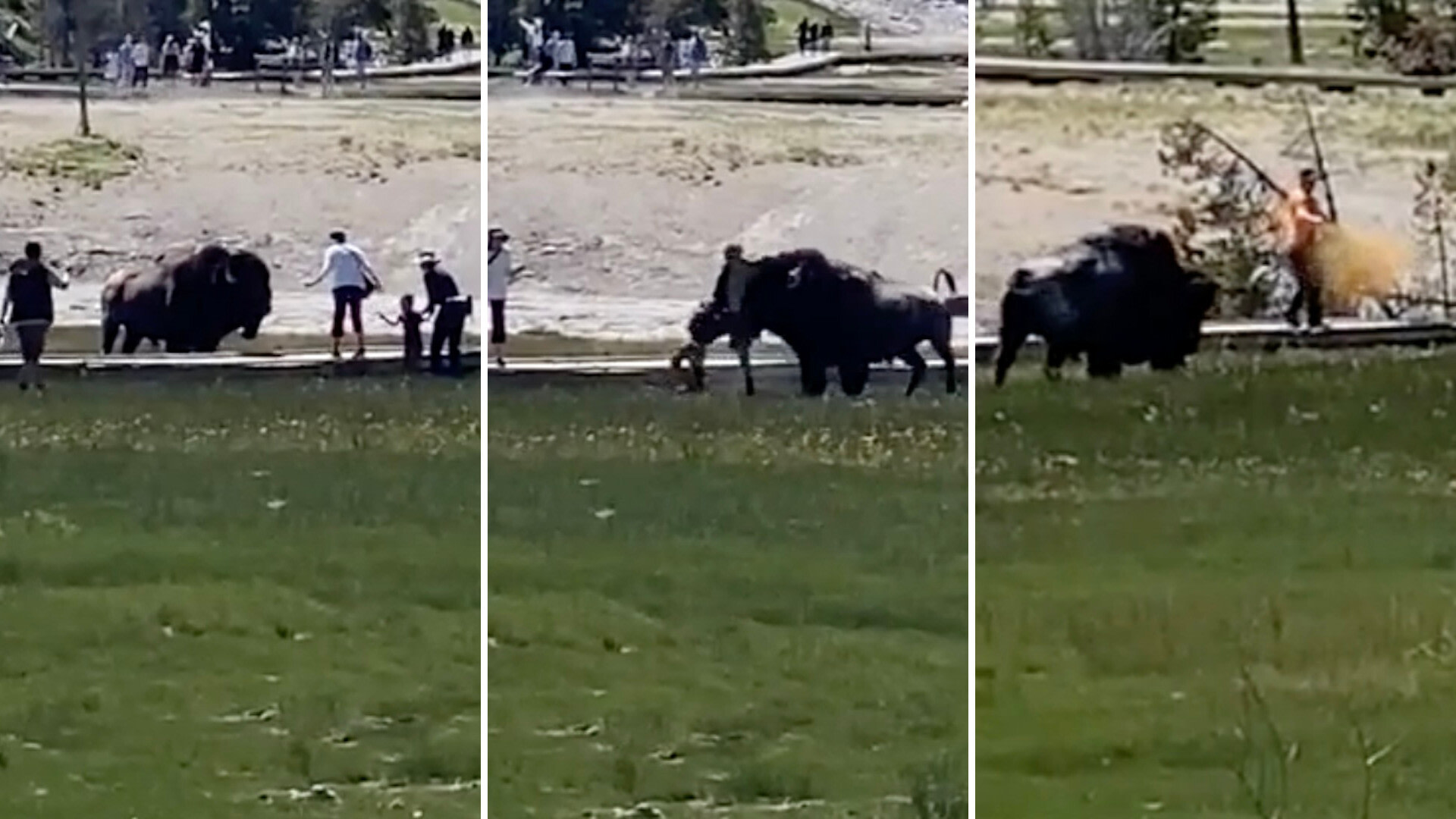 The bison charges the group, and the child seems to run from the animal and then gets rescued by one of the adults. However, the family does not escape unscathed — the bison appears to headbutt one adult who is carrying the child to safety. Luckily, this one attack was enough for the animal, which then moves away.