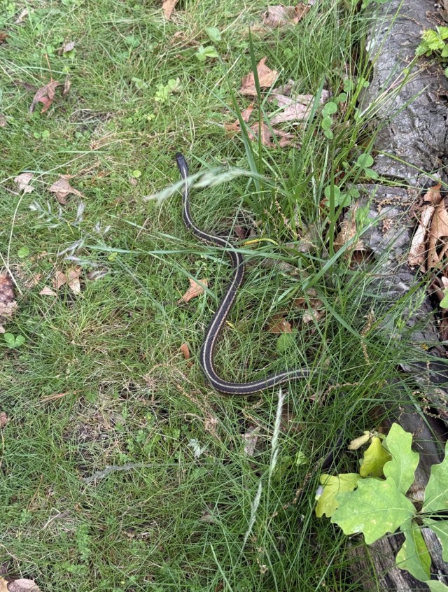 People in the comments identified the snake as a garter snake and had a lot to say about them. Native gardens often attract a variety of bugs and pollinators, so a wild snake is another beneficial member of the wildlife to be expected, possibly.