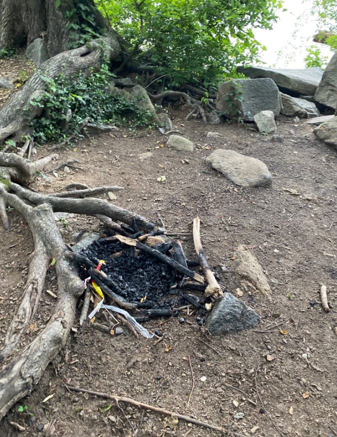 "Went for a lovely dusk walk at Pony Pasture yesterday and came across this abomination," the caption read. In the picture, the old fire is built around two exposed roots, which could harm the tree. The ashes also leave some trash.