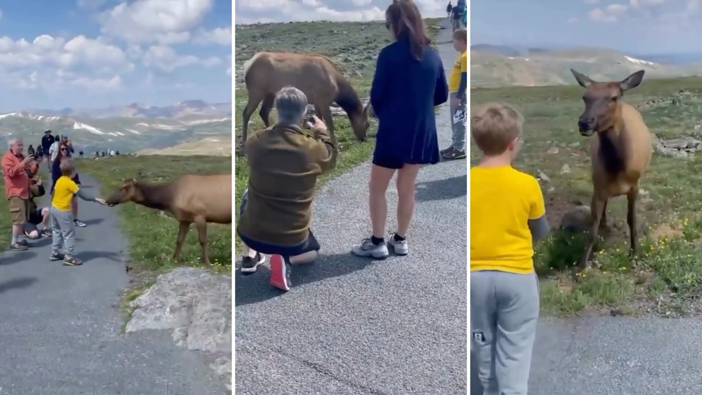 In the video taken at Rocky Mountain National Park, the child feeds the animal while family members move up closer to take photos.