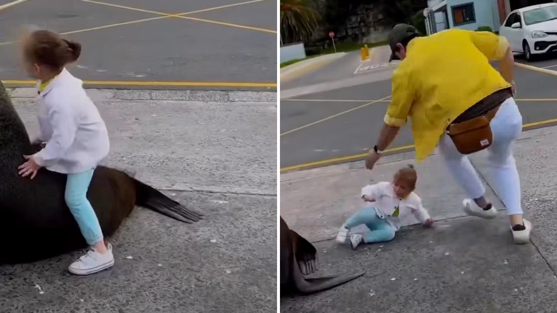 The clip, presumably filmed by the child's parents, shows the toddler hopping onto a resting sea lion and then quickly being shaken off when the animal jerks its body around. The little girl lands on the pavement crying as her father rushes over to pick her up.