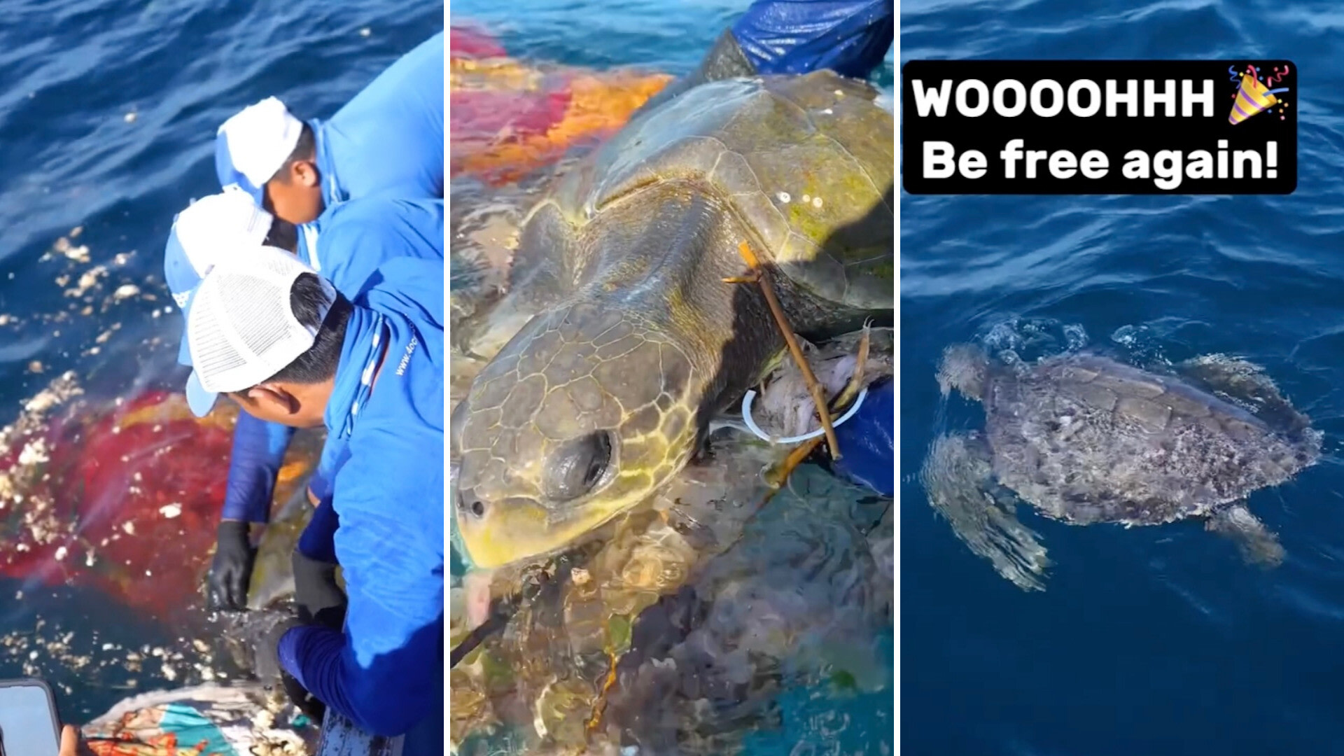 Hauling the turtle on board, they quickly cleaned him of plastic and allowed him to recuperate. According to the crew, when he was first rescued, he was "too exhausted to survive on [his] own, with numb flippers and half-closed eyes."