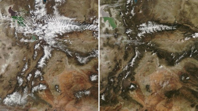 Side-by-side photos from NASA satellites visualized alarming conditions, depicting the staggering loss of accumulated snow within just one month.