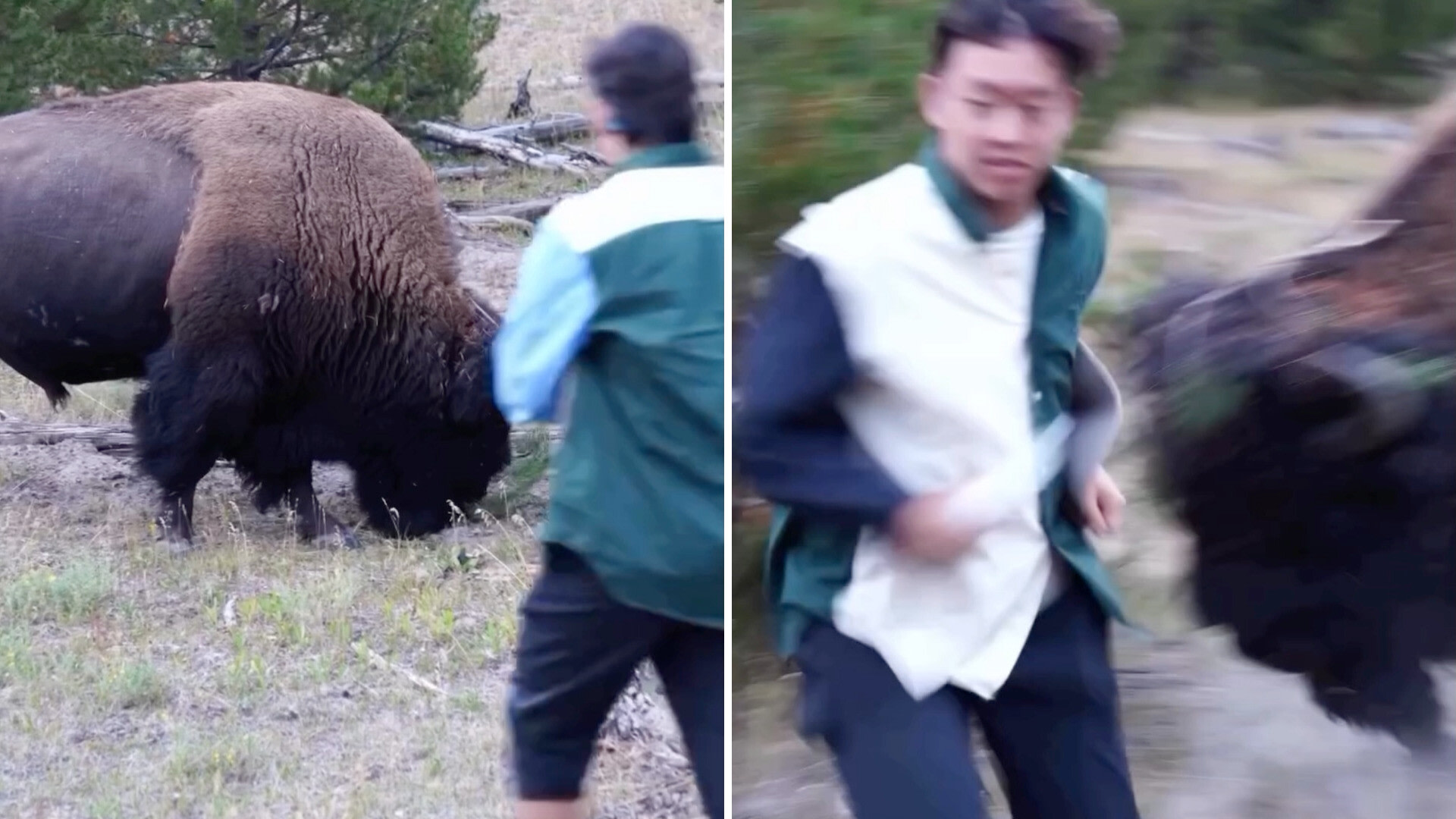 Despite this, the tourist brazenly continues walking toward the bison and instantly regrets it.