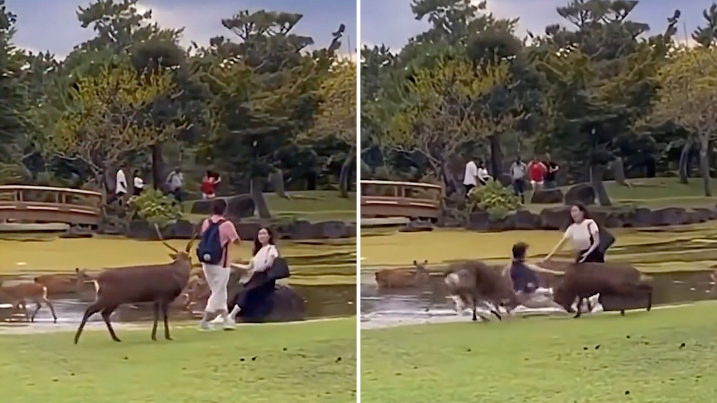 In the video, the deer charges at the tourist, with another deer joining briefly before the unfortunate tourist falls to the ground as all the surrounding deer run away.