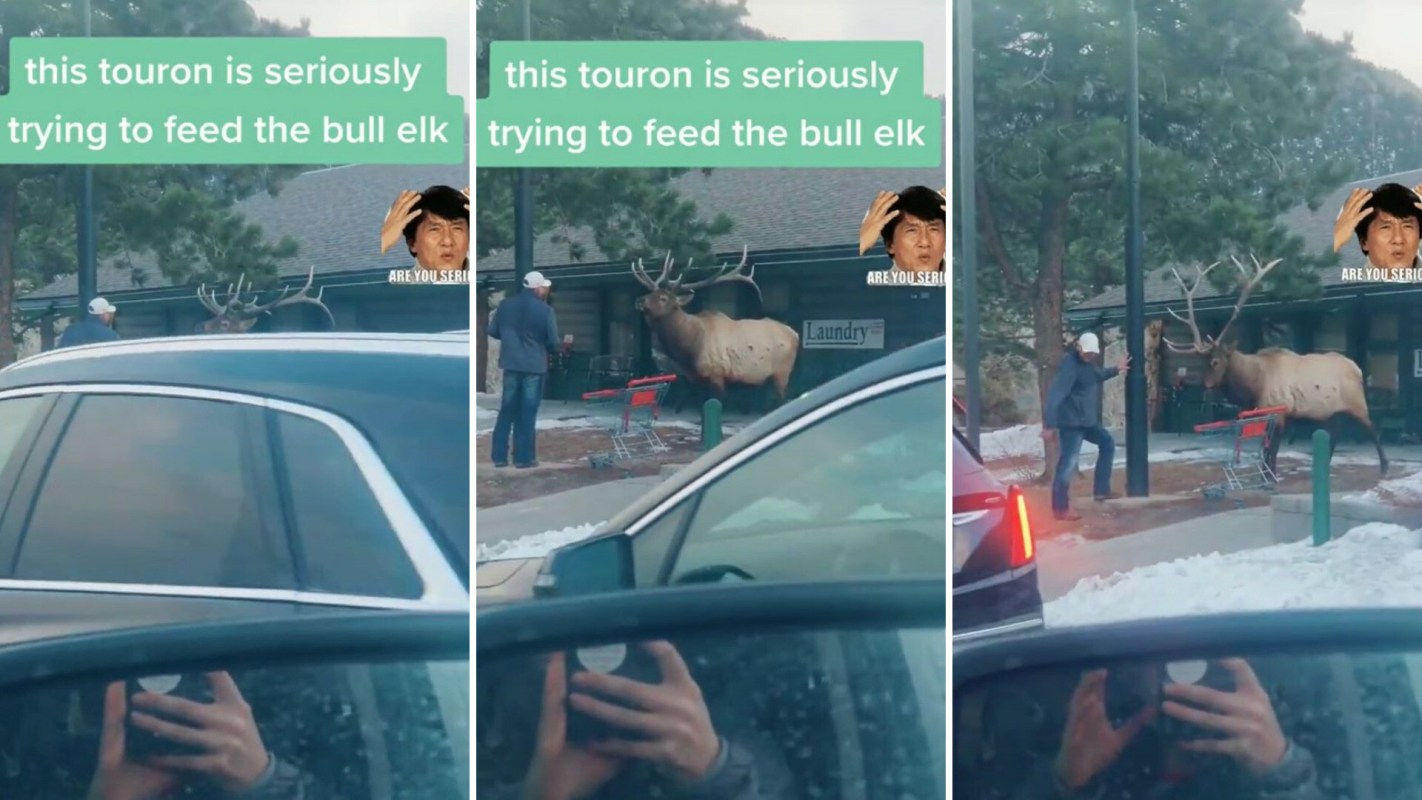 "This [tourist] is seriously trying to feed the bull elk," they captioned the video. "Don't feed the wildlife, y'all, and keep a safe distance."