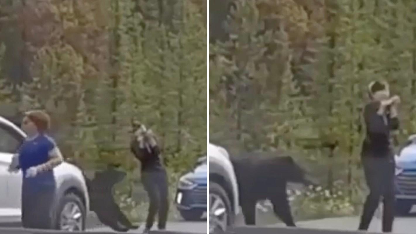 Later in the clip, one woman with her back to the bear appears to have no idea that the bear lunged incredibly close to her, narrowly missing her before it returned to the grassy roadside.