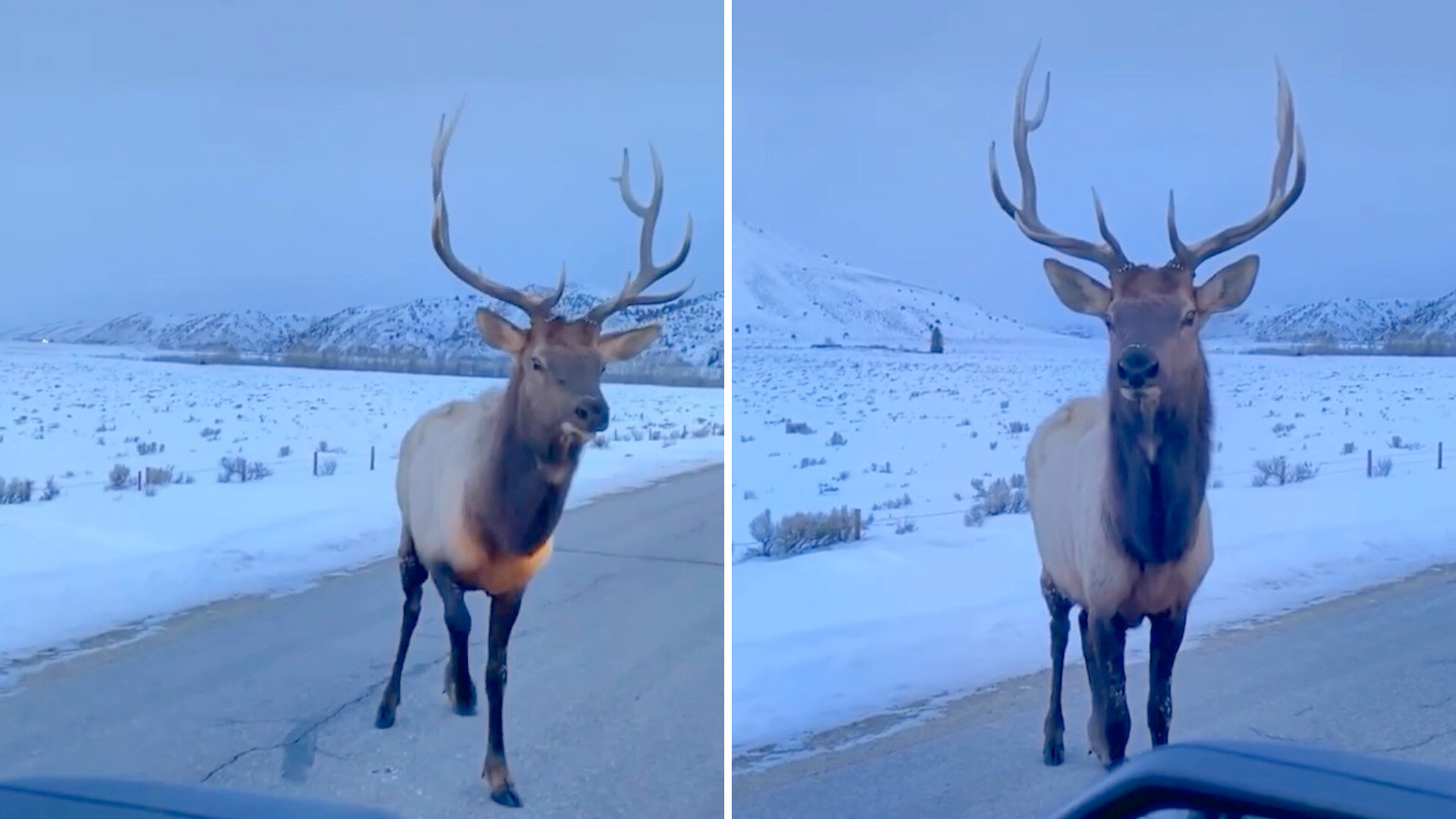 In the clip, we can see a driver who happens across a wild elk in the middle of a road. Instead of giving the elk some space and waiting until they crossed the road, the driver continued to slowly pull up closer to the animal until they were just feet away.