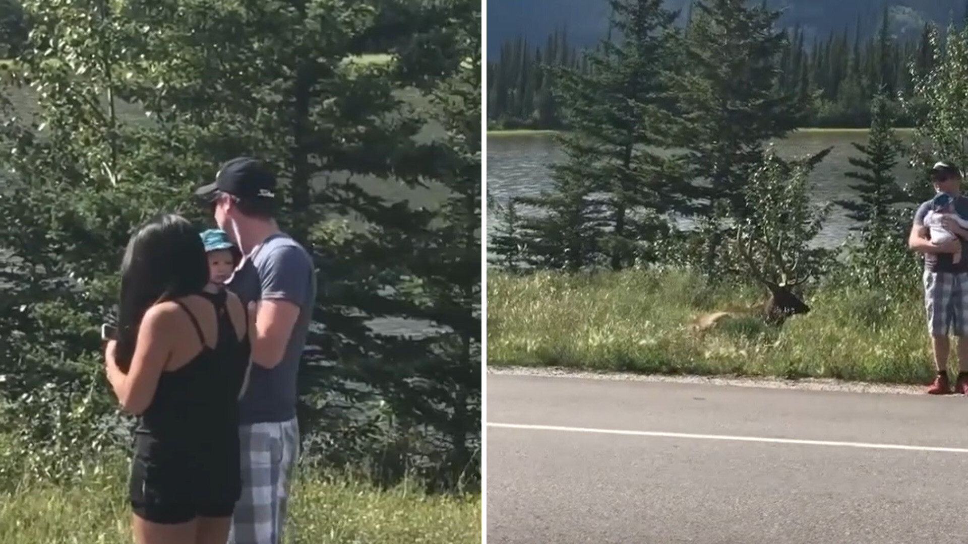 The video showed parents taking selfies with their baby in front of a large bull elk in Jasper National Park. The adults showed very little care in getting close to the elk or pulling out their cameras to snap photos of the majestic creature lounging by a busy road in the park.