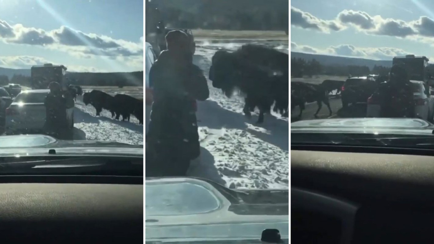 In the clip, three people are seen outside of their vehicles during what appears to be a bison traffic jam, spurning the National Park Service's safety recommendations.
