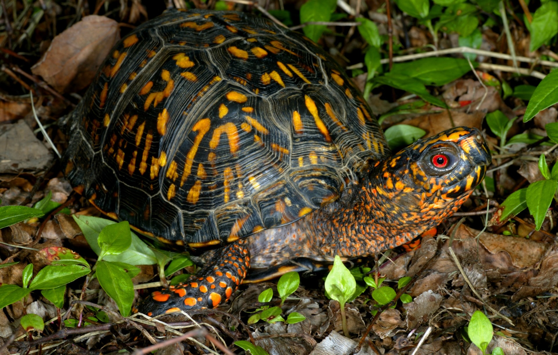 The turtle, a vulnerable species, is threatened by the illegal pet trade as well as habitat destruction and fragmentation. Its striking black or brown and yellow or orange colors are matched by the males' red eyes. Females can store sperm for up to four years before laying fertile eggs.