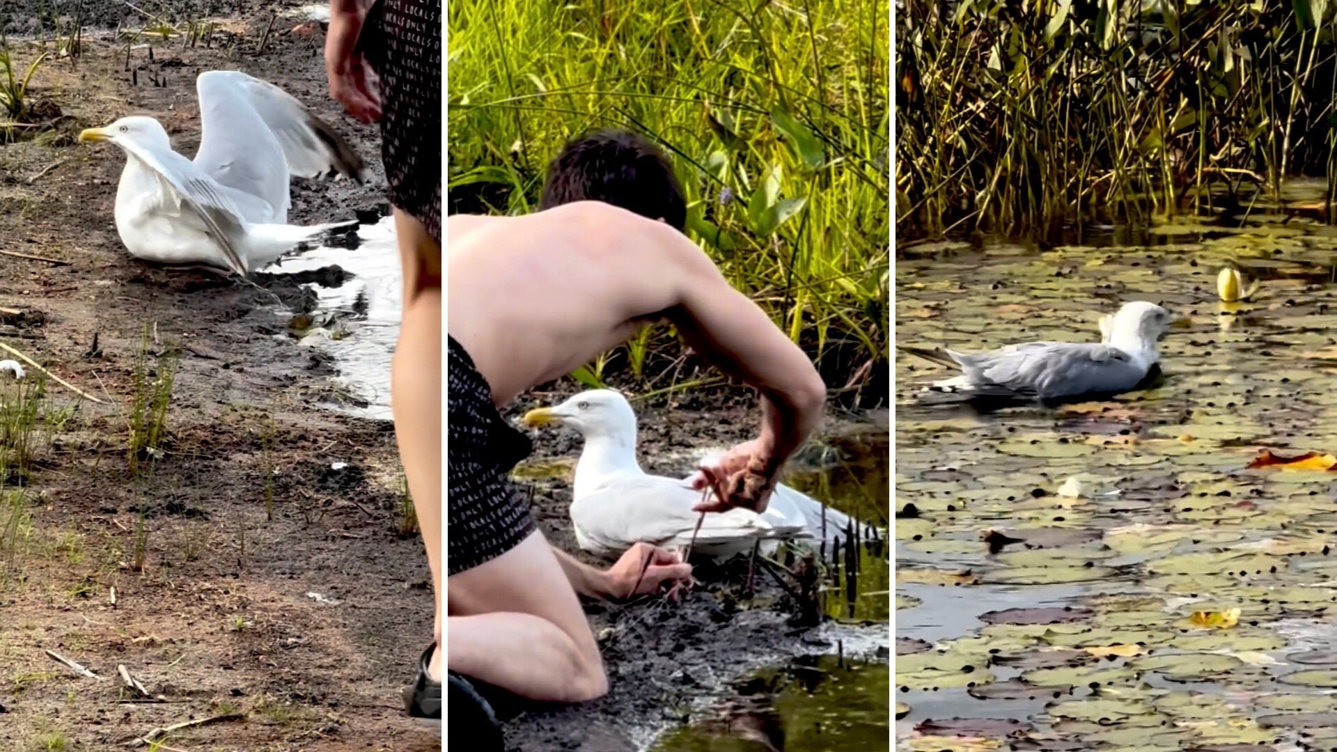 Luckily for this seagull, Hynes is planning to help make things right. Scissors in hand, he slowly bends down and begins cutting away the knots impeding the seagull's movement. At one point, the bird appears to realize the actor is there to assist and simply gazes up at him as he works. Finally, the seagull is free and swims away seemingly no worse for the wear.