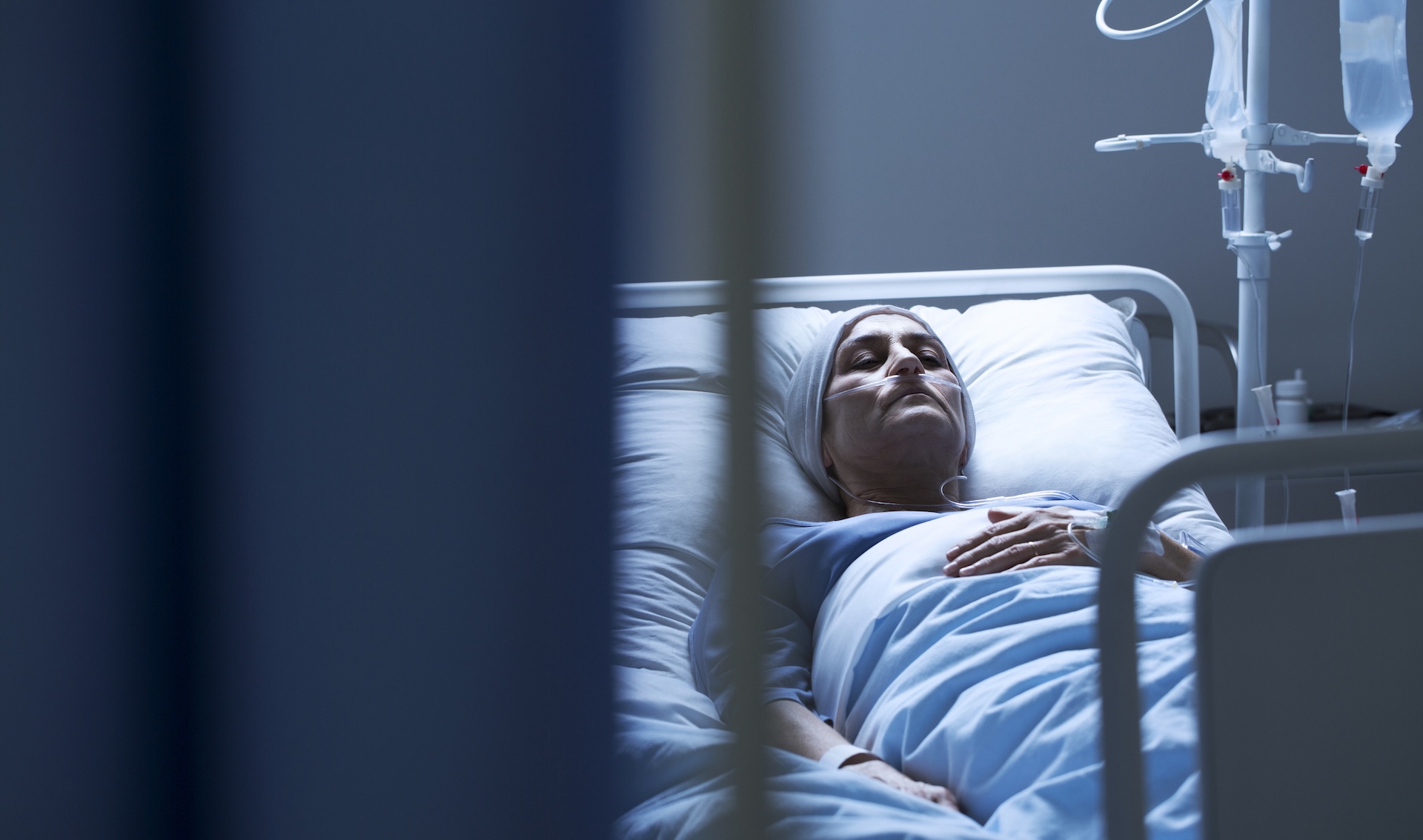 A woman lies in a hospital bed amid dark surroundings.