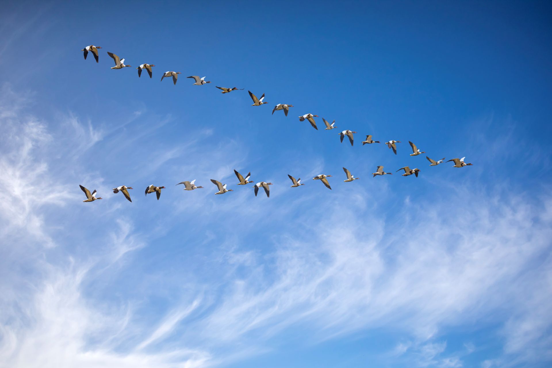 A flock of geese flying in a V formation against a clear blue sky with wispy clouds.