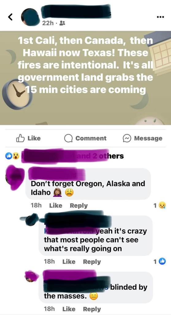 "1st Cali, then Canada, then Hawaii now Texas!" the shared post read. "These fires are intentional. It's all government land grabs the 15 minute cities are coming."