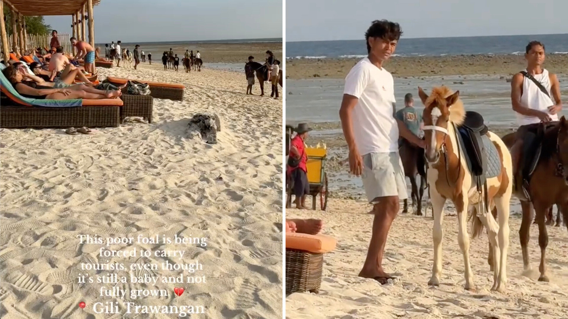 "This poor foul is being forced to carry tourists, even though it's still a baby and not fully grown," she wrote in the caption. "This is pure animal cruelty. I filmed what's happening and reported it to the Gili Eco Trust. They are already aware of the case and have even spoken to him. Sadly, he just laughed and refused to listen. This cannot go on."