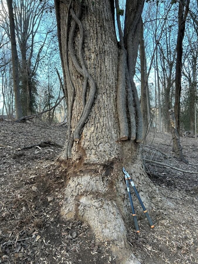 Zillmer explained that on public lands, volunteers are not permitted to use herbicide and added: "Usually Wintercreeper adheres to the tree and you can't remove the base, so you just have to cut it twice to make a window. But I did find some success with severing the roots and ripping them out, and even removing the base sections of some huge vines!"
