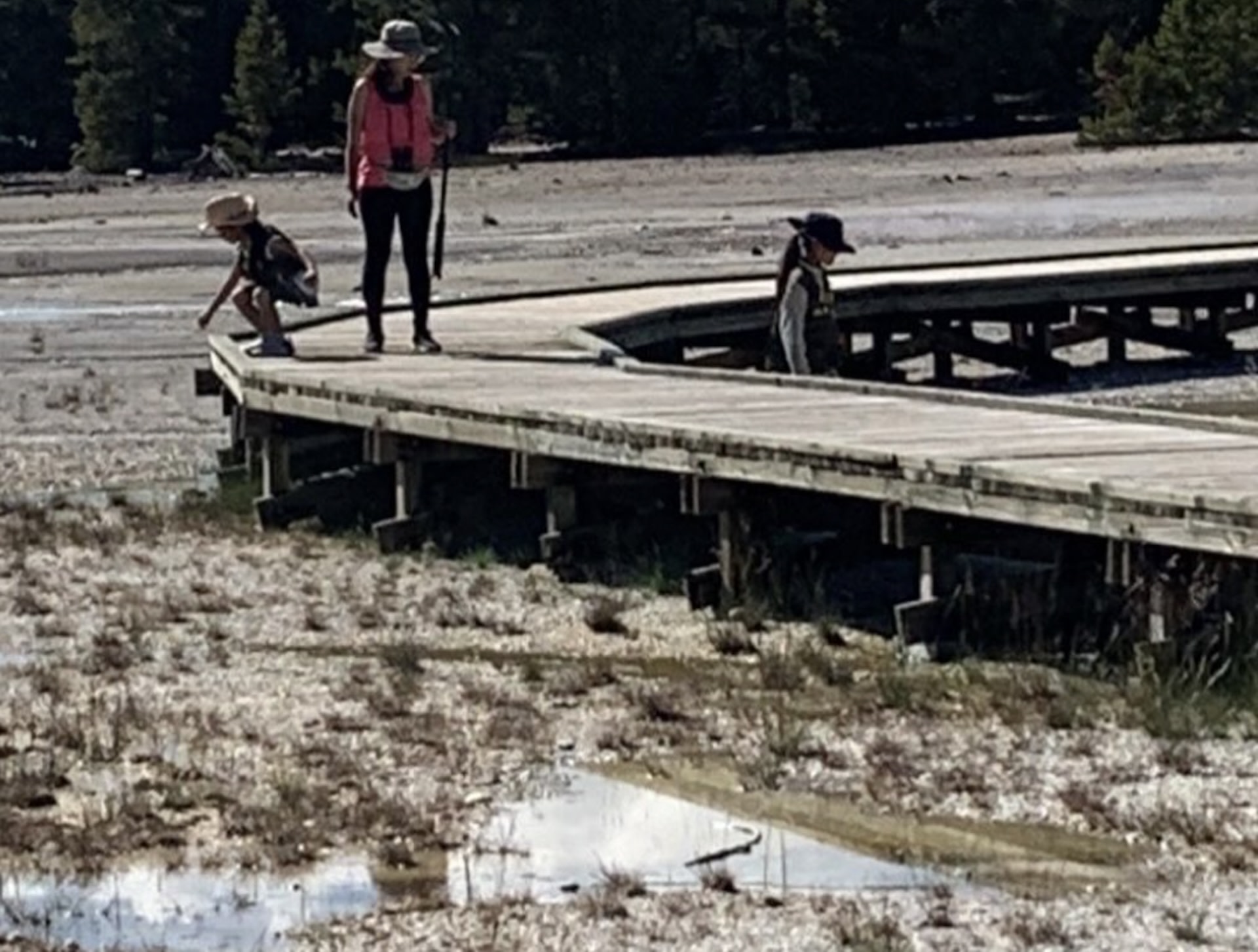 The photo was taken at the Norris Basin in Yellowstone National Park. The young girls are wearing park ranger suits, and the family is on a raised boardwalk. However, one daughter had ditched the trail and was standing on the off-limits bacteria mats.