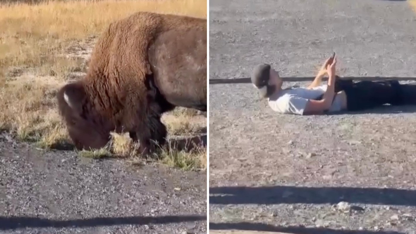 In a video shared by the Tourons of Yellowstone Instagram account (@touronsofyellowstone), a young man appears to be lying on his back in the middle of a dirt road mere feet away from a bison grazing on dry greenery.