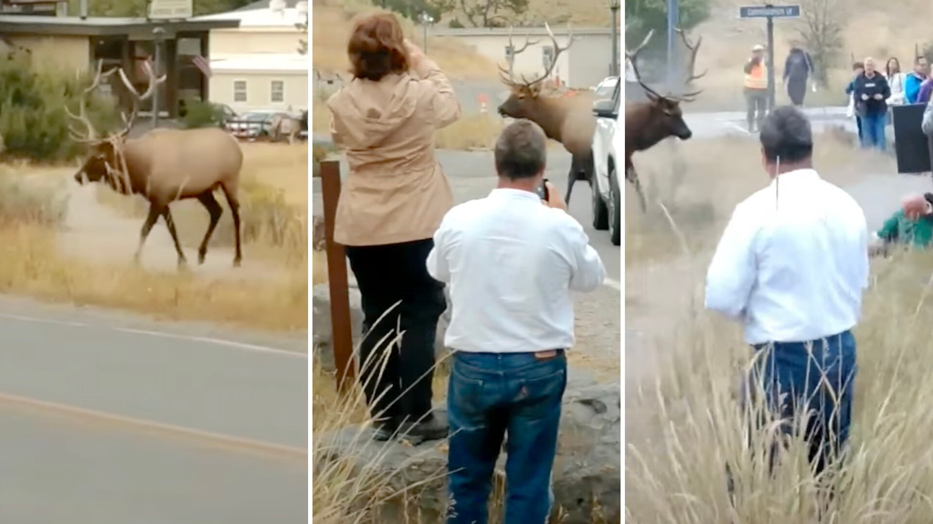 A tourist captured a video of a man getting pummeled to the ground by an elk at Yellowstone National Park.