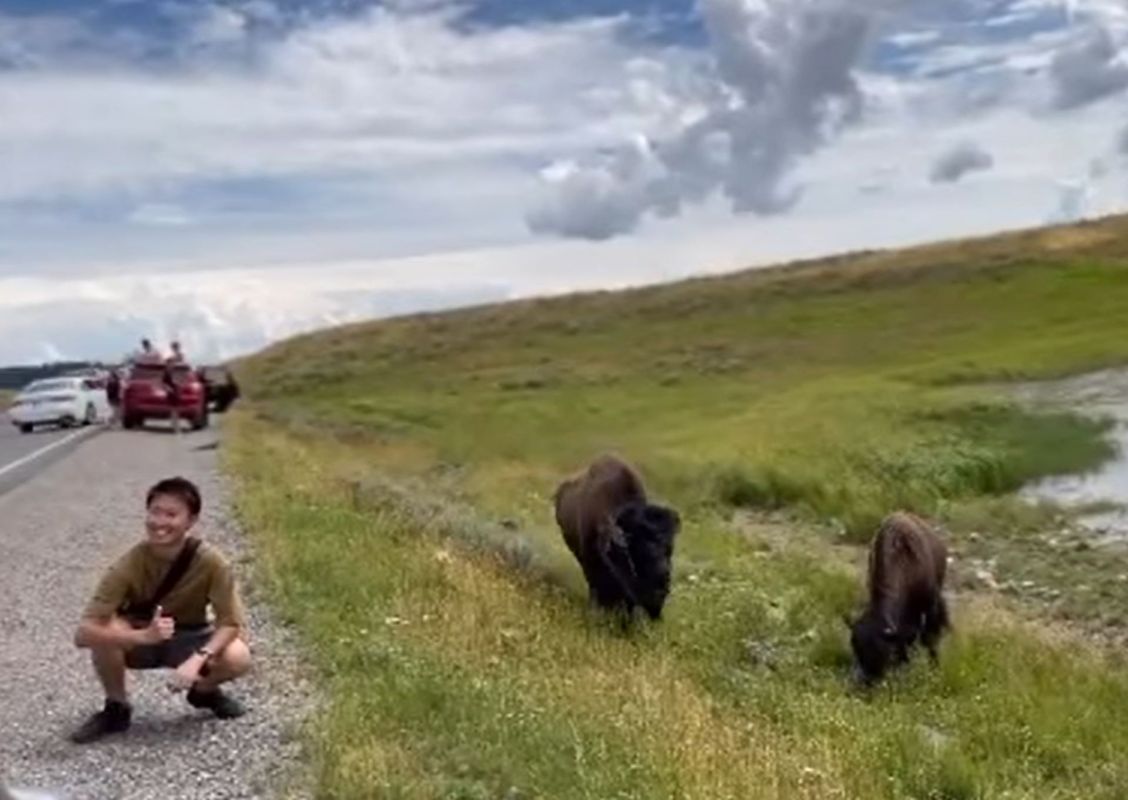 The video, uploaded by Zach Keller (@_zachkeller), shows a tourist crouching on the side of a grass verge where two bison were happily grazing.