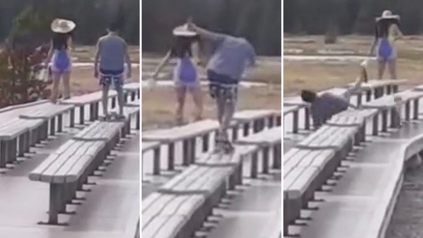 Originally captured by outdoor enthusiasts Tess Whittlesey (@yellowstonebaby) and Ryan Harris (@ry_harris406) before being posted to the account Tourons of Yellowstone (@touronsofyellowstone), the clip highlights two people rollerblading and skateboarding illegally on the boardwalk by Old Faithful, where one of the parkgoers abruptly falls off their skateboard at the end of the video.