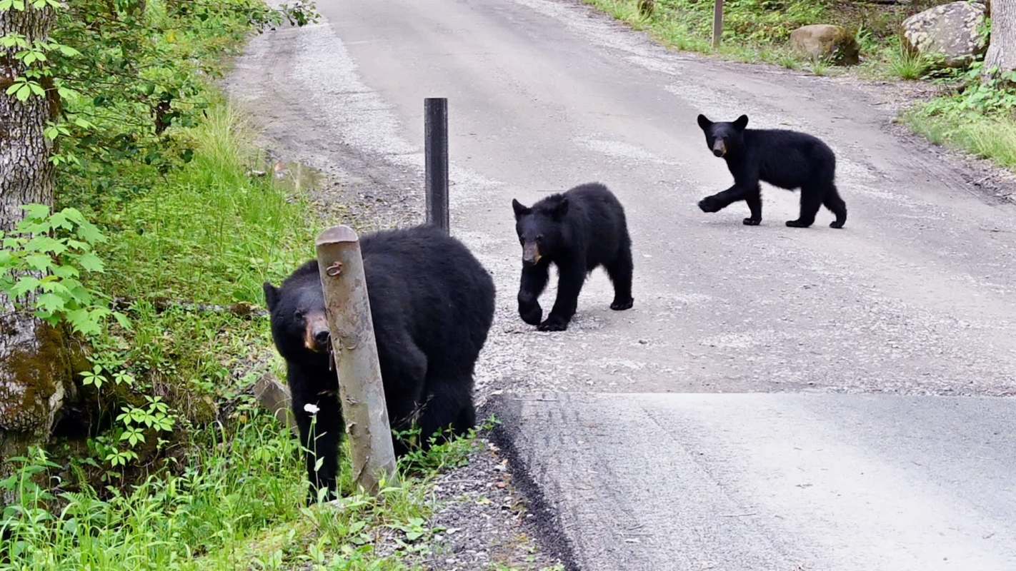 In the video, a mother grizzly leads her cubs across a road lined with dozens of visitors and vehicles. While most people observed from a safe 100-yard distance, some photographers moved in for a closer look.