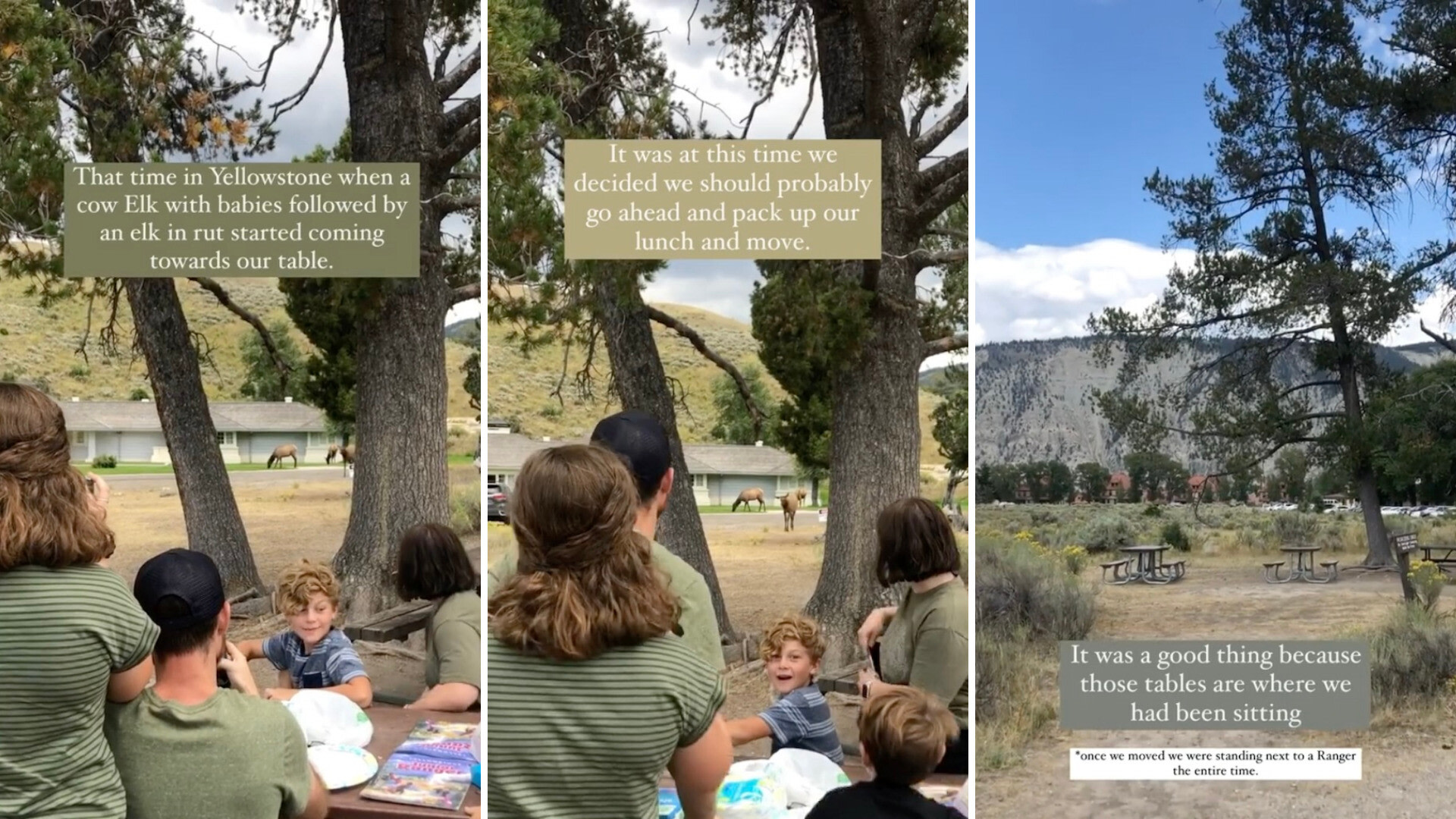 As a family of elk close in on their picnic table, the group relocates to keep their distance.