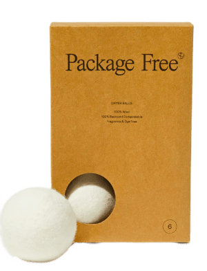 Package Free dryer balls are made from 100% compostable wool, meaning they won't create waste at the end of their (long!) life. They also help reduce static, wrinkles, and drying time.