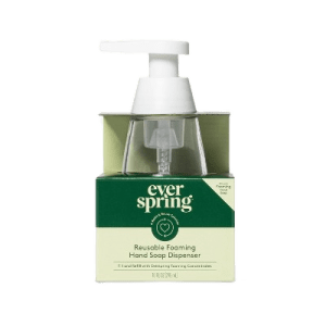 Everspring's cleaning and hygiene offerings are a great example of how brands can be more sustainable. Buy the glass foaming dish soap dispenser once. After that, you can just buy the affordable $3.99 dish soap concentrate packets (shout out to the lavender & bergamot scent … yum!) made from bio-based, plant-derived ingredients.
