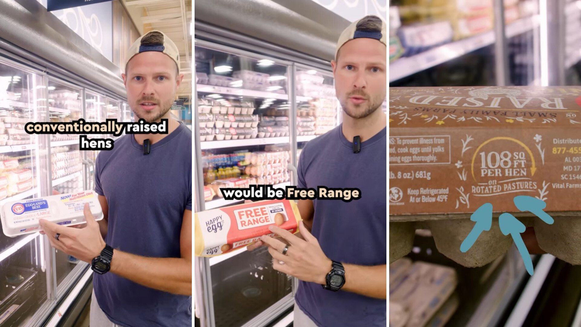 The video follows nutritionist Craig McCloskey (@craig_mccloskey) through the grocery store as he details why it's important to understand the labels on the egg cartons.