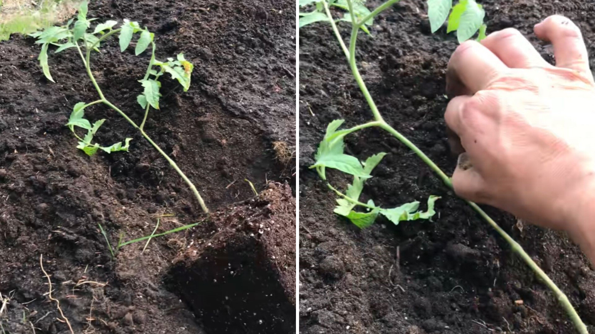 The routine involves laying the tomato plant down in the soil and then pinching off all the leaves around the base. The second step is covering the stem with soil while allowing the top to remain exposed.