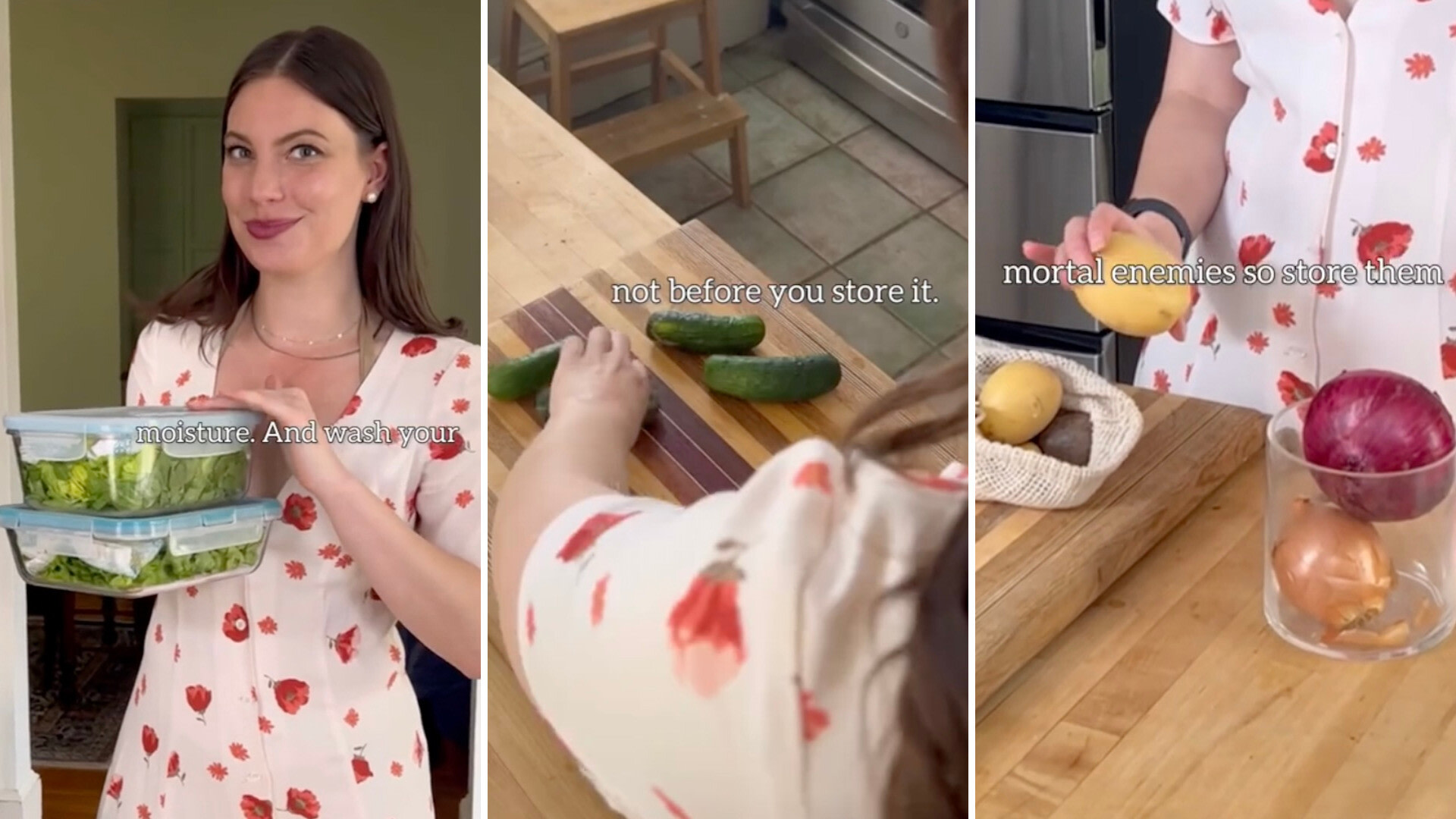 In another tip, Kellogg said you should "wash your produce before you eat it, not before you store it." Finally, she suggested storing potatoes and onions separately in a cool, dark place.