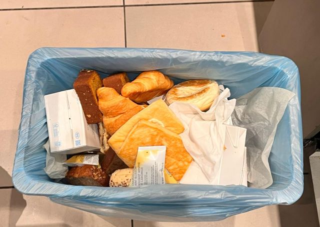 The employee shared a photo of a trash can full of bread, bagels, and pastries that had been thrown out due to a new policy at least at their location, which they'd just learned about that night.